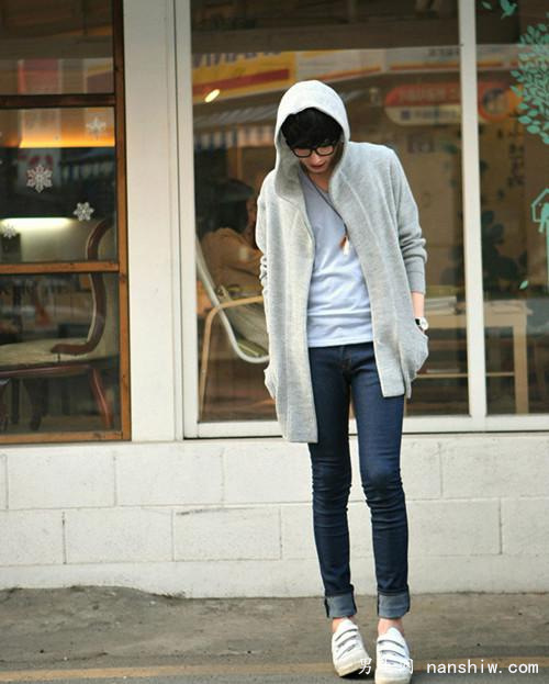 韩版的浅灰色纯色开衫内搭灰色v领T恤,下身搭配蓝色挽脚牛仔裤和白色休闲板鞋,充满小清新气息,连帽设计增添时尚气息,这样的一身装扮非常休闲!